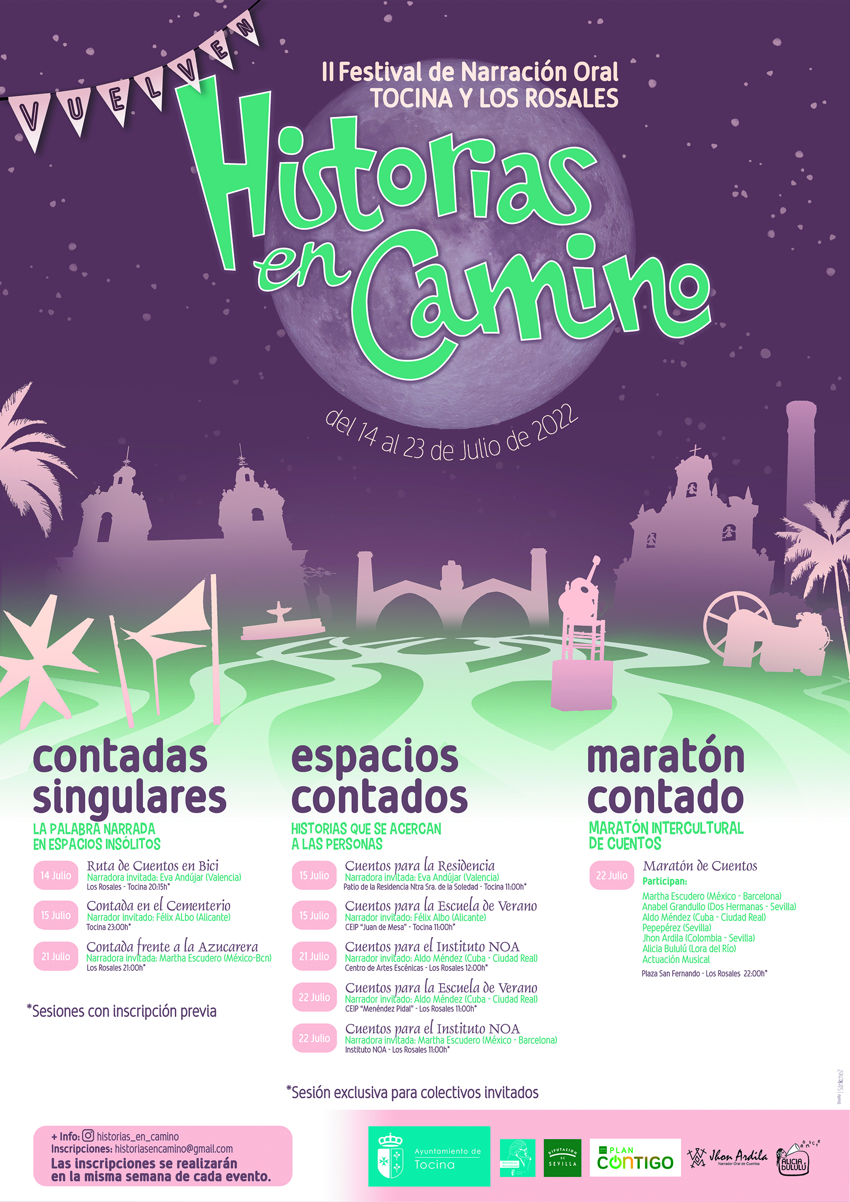 La inauguración será el día 14 de julio con una Ruta Ciclista por el carril que une las dos poblaciones, con paradas en las que habrá narración de historias. También se ofrecerán Paseos Contados los días 15 y 21 de julio por Tocina y Los Rosales respectivamente, visitando plazas y lugares emblemáticos. Durante todo el mes se llevarán a cabo visitas a distintos lugares haciendo que la palabra viaje a colectivos que por diversas circunstancias no pueden participar en el festival; todo ello para aterrizar en una clausura por todo lo alto, el día 22 de julio con una Gran Maratón Intercultural de Cuentos donde habrá un variedad amplia de participantes de distinta procedencia y acompañada de música.