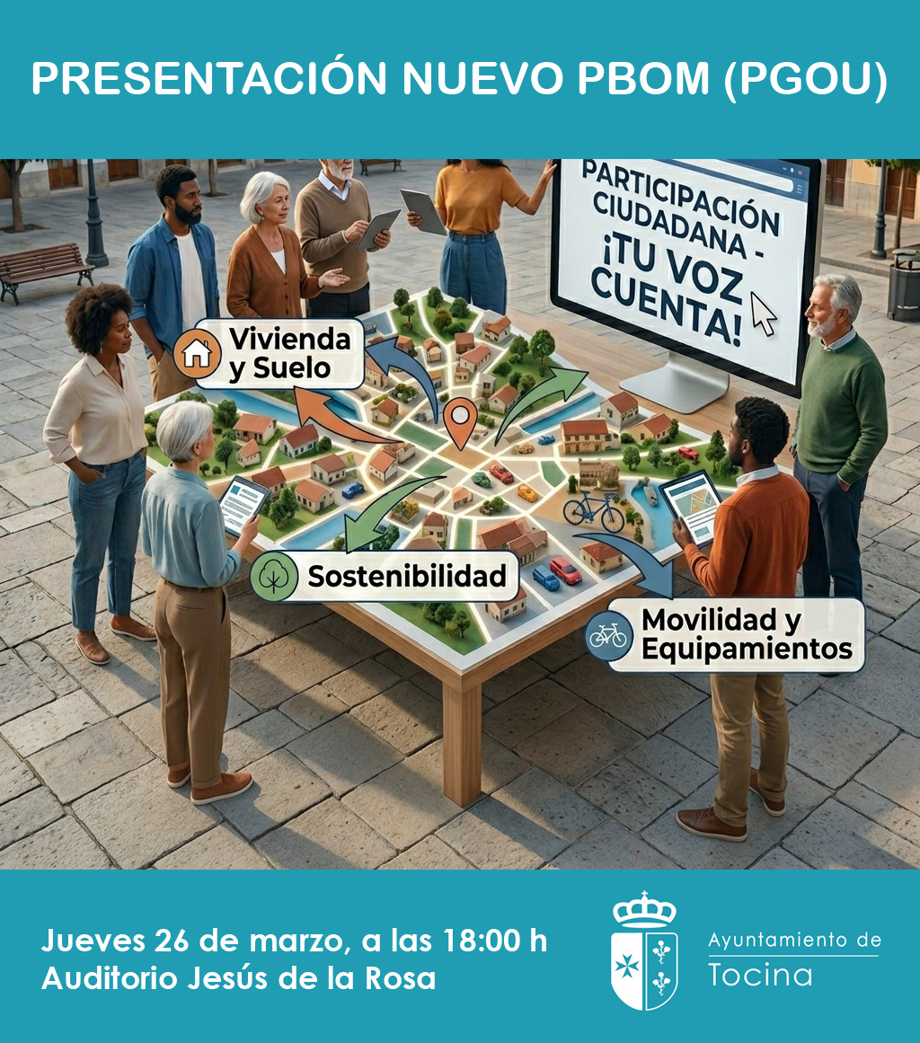 Este jueves a las 18:00 h, en el auditorio Jesús de la Rosa, tendrá lugar el acto de apertura pública del proceso de elaboración del Plan Básico de Ordenación Municipal (PBOM), para el cual es fundamental la participación ciudadana. Esta jornada será clave para definir el modelo de crecimiento y desarrollo de nuestra localidad en los próximos años.