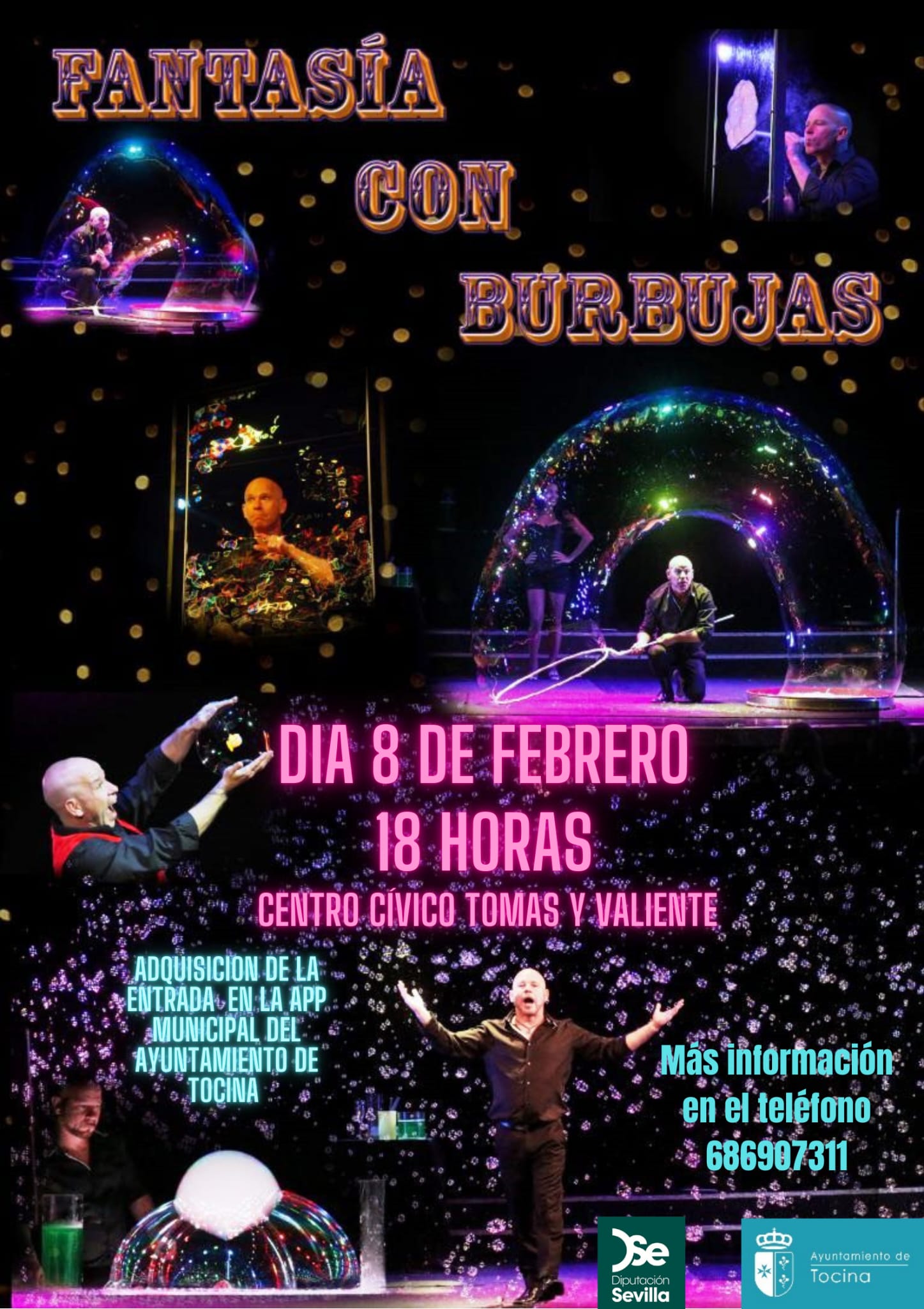 La Delegación de Cultura del Ayuntamiento de Tocina ofrece al municipio el espectáculo infantil “Fantasía con burbujas”, el próximo 8 de febrero en el Centro Cívico Tomás y Valiente en Los Rosales a partir de las 18 h.