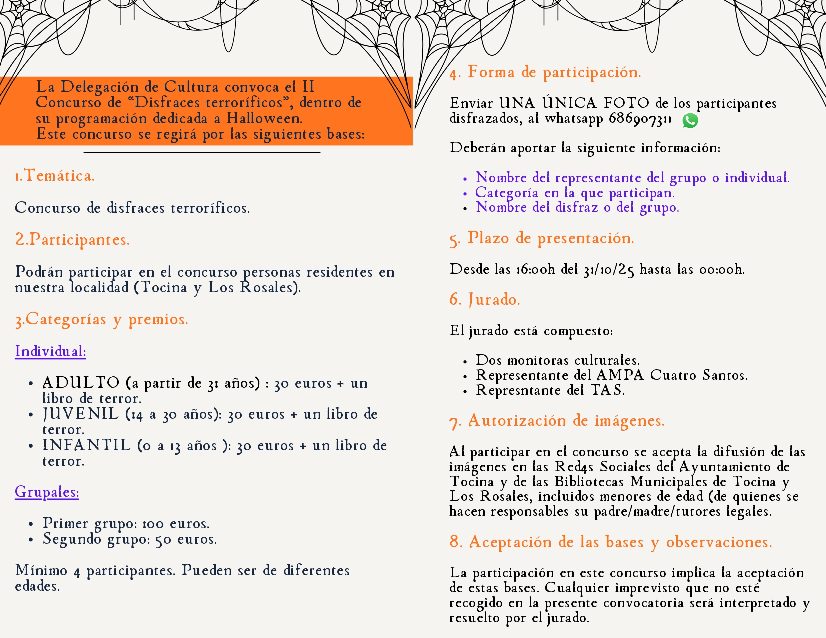 La Delegación de Cultura del Ayuntamiento de Tocina, prepara un año más una tarde llena de risas espeluznantes y espectáculos para todos los públicos en torno a la festividad de Halloween, el 31 de octubre.