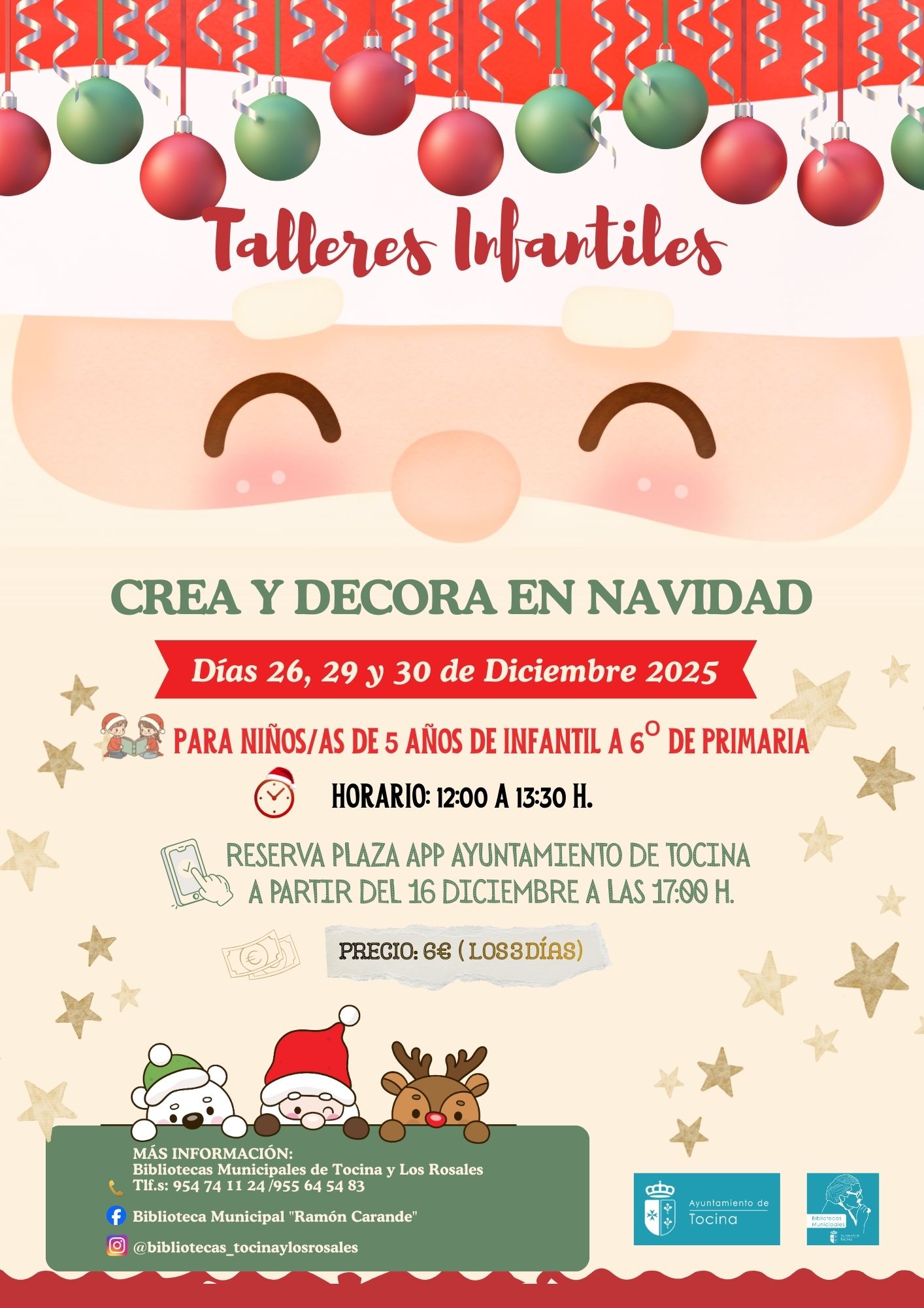 Las Bibliotecas Municipales de Tocina y Los Rosales vuelven a apostar estas Navidades por la creatividad y el entretenimiento educativo con una nueva edición de los talleres infantiles de manualidades “Crea y decora en Navidad”, incluidos en su programación anual de actividades de fomento a la lectura.