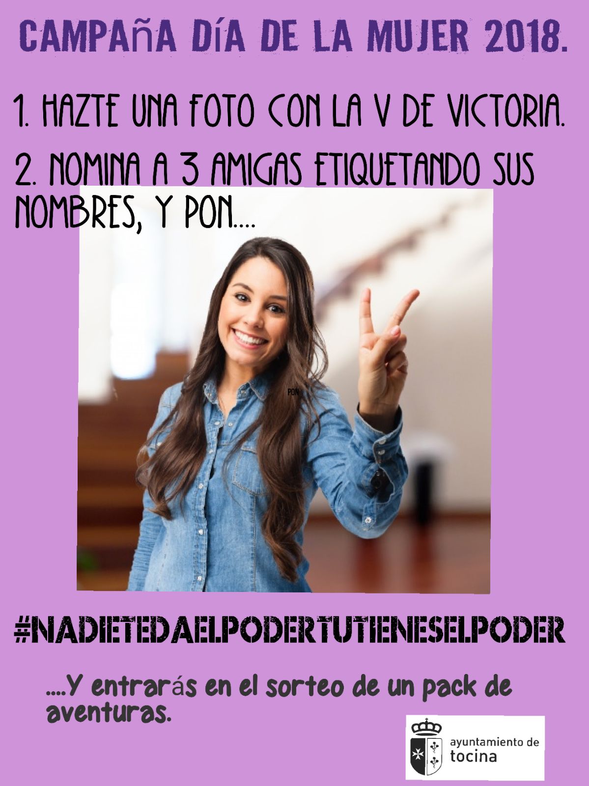 La campaña de apoyo a las mujeres en facebook, que este año se titula #nadietedaelpodertutieneselpoder amplía su plazo hasta el 7 de marzo. Con este lema toda mujer que quiera participar deberá subir a faceebook una foto en la que aparezca con la señal de victoria, es decir, haciendo la V con los dedos poniendo el hashtag #nadietedaelpodertutieneselpoder y etiquetando a tres amigas. Si cumple su publicación estos requisitos entrará en un sorteo de un pack de aventuras. Todas las personas participantes entrarán en un sorteo de un magnifico regalo, sorteo que se realizará en el acto conmemorativo del Día de la Mujer (8 de marzo a las 18 horas en el Auditorio Jesús de la Rosa).