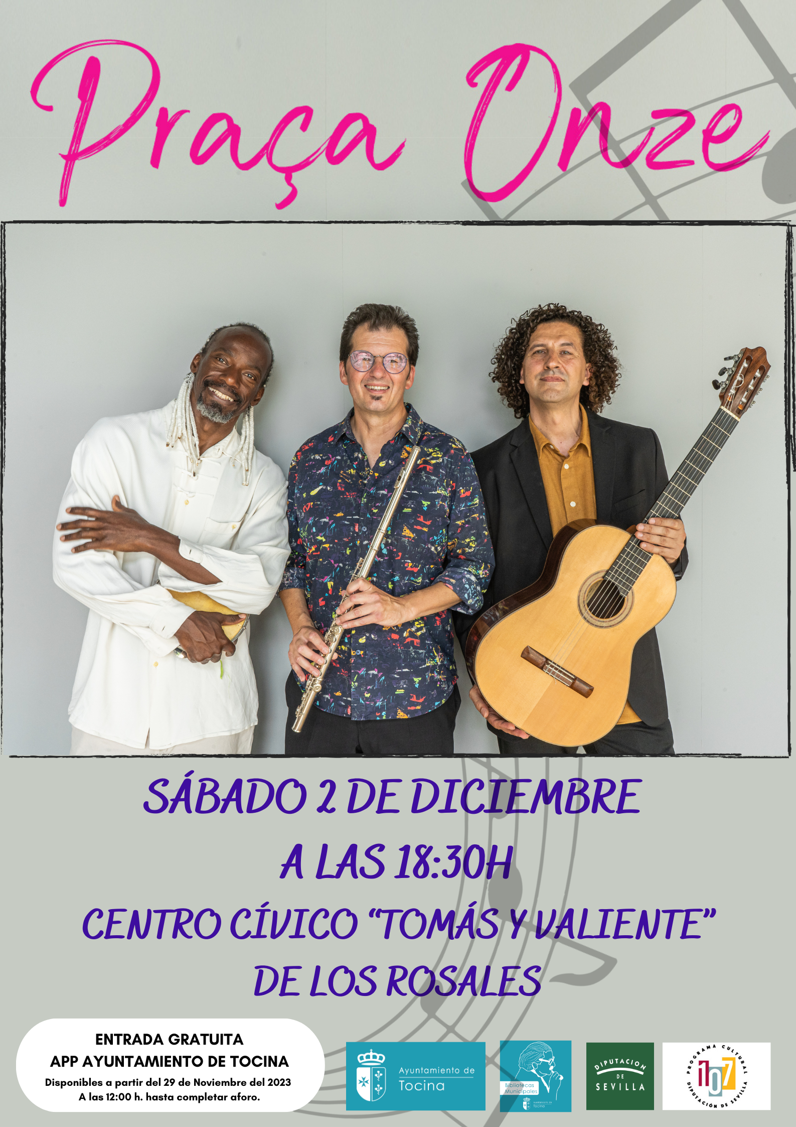 La Delegación de Cultura del Ayuntamiento de Tocina a través de las Bibliotecas Municipales y la Diputación de Sevilla ofrece al municipio dentro de su programación cultural un concierto de músicas del mundo con el grupo “Praça Onze”. Los asistentes podrán disfrutar de samba, bossa, jazz y música brasileña contemporánea.