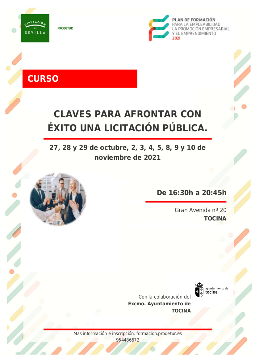 Hasta el 20 de octubre pueden solicitar la realización del curso presencial "Claves para afrontar con éxito una licitación pública", organizado por Prodetur en colaboración con el Ayuntamiento de Tocina. Dirigido a personas empresarias y profesionales por cuenta propia o ajena que deseen mejorar sus habilidades de gestión, actualizar conocimientos, modernizar sistemas y/o afrontar nuevas líneas de negocio, así como personas desempleadas que necesiten optimizar su capacidad profesional y empleabilidad. Con los conocimientos del curso se pretende proporcionar claves prácticas para participar con éxito en una licitación pública. Se aprenderá a elaborar correctamente las ofertas en los aspectos administrativos y técnicos, incluyendo elaboración de: DEUC, inscripción en registro de licitadores, solvencia técnica y económica, ofertas económicas y propuestas técnicas, y cualquier otra información que sirva para afrontar cualquier proceso de licitación con plenas garantías de que la documentación presentada cumple todos los requisitos exigidos en los pliegos y de que la elaboración de la oferta es la más ventajosa posible. Recordamos que la licitación es un sistema por el que los ayuntamientos, y otras administraciones, adjudican la realización de una obra o un servicio a la persona o la empresa que ofrezca las mejores condiciones, por lo que conocer el proceso de licitar gracias a este curso se convierte en una herramienta más que recomendable para afrontar con éxito este proceso de selección.