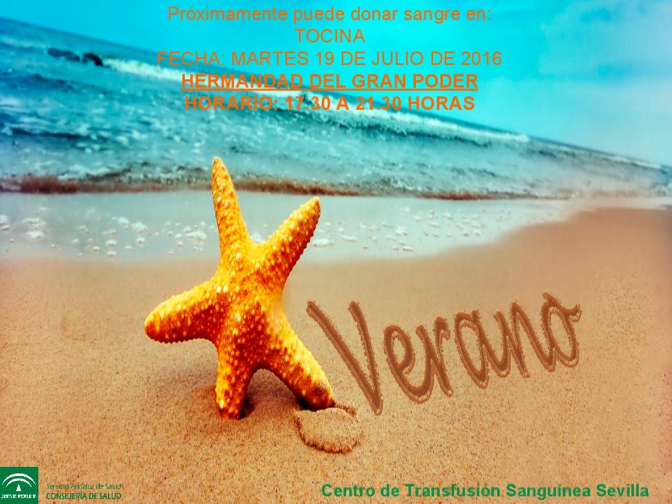 El martes 19 de julio habrá una campaña de donación de sangre en Tocina. Será en la Hermandad del Gran Poder, en horario de 17:30 a 21:30 horas. Se necesita sangre de todos los grupos sanguíneos.