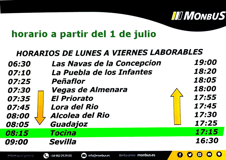 La empresa que explota la línea Tocina- Los Rosales- Sevilla, comunicó en la tarde de ayer que el servicio deja de ser bajo demanda, como lo ha estado haciendo en estos meses de pandemia (había que llamar por teléfono para que el autobús pasase). Con todo, el servicio sigue lejos de volver a la normalidad, dado que solo circula un autobús en cada sentido de lunes a viernes. De Tocina a Sevilla solo sale uno a las 8:15 h., mientras que el autobús de vuelta sale de Sevilla a las 16:30 h.