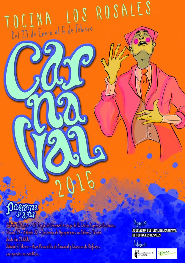 La Asociación Cultural del Carnaval de Tocina y Los Rosales celebrará el próximo sábado 23 de enero a partir de las 21 h. en el Salón de Actos Dulce Chacón el tradicional Pregón del Carnaval. Este año corre a cargo de J.Carlos Espinosa Fernández, en un acto que estará presentado por Eduardo Arroyo Naranjo. Tras el acto se realizará en el patio de Salón una cena homenaje al pregonero.