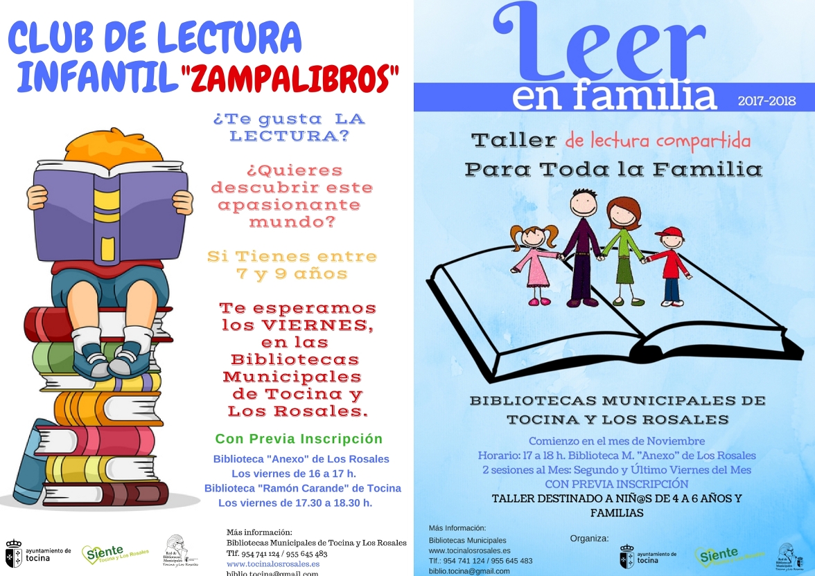 Para fomentar la lectura y la creatividad entre los/as más pequeños/as de nuestro municipio, las Bibliotecas Públicas Municipales de Tocina y Los Rosales ponen en marcha dos nuevos proyectos: dos clubes de lectura infantil “ZAMPALIBROS” dirigido a niños/as de entre 7 y 9 años y un taller de lectura compartida, “LEER EN FAMILIA”, dirigido a niños/as de 4 a 6 años de edad y un familiar.