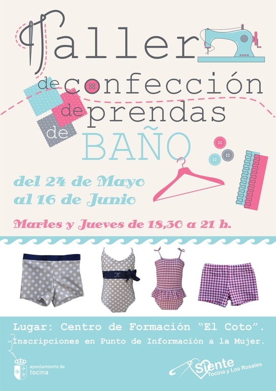 La Delegación de Igualdad del Ayuntamiento de Tocina organiza un nuevo taller, en este caso de confección de prendas de baño, que tiene previsto su comienzo el próximo 24 de mayo.