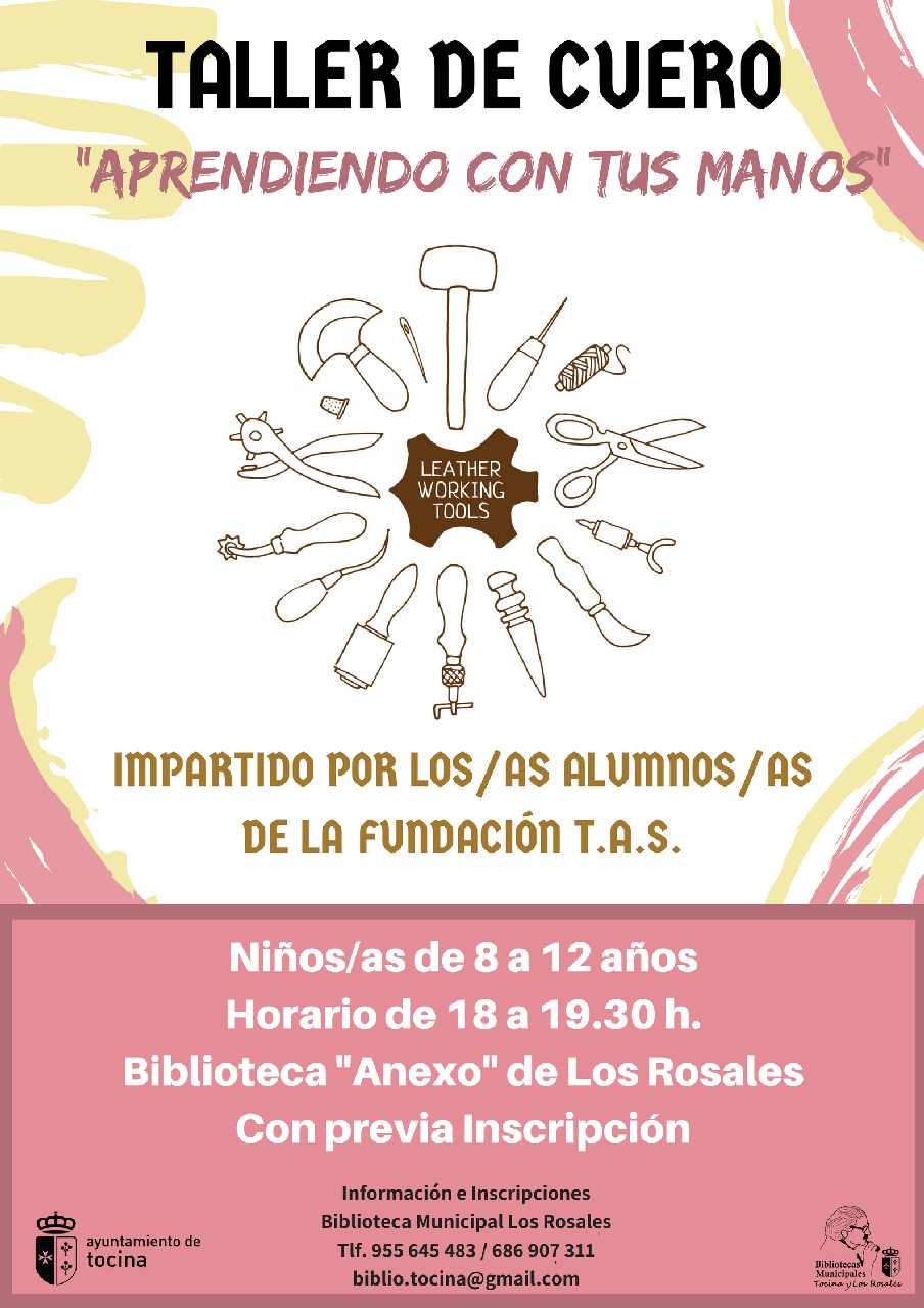 Los días 9 y 16 de octubre en horario de 18 a 19:30 h. la Red de Bibliotecas Públicas Municipales de Tocina y Los Rosales junto a la Fundación TAS de nuestro municipio organiza un taller de cuero destinado a los niños/as de entre 8 y 12 años.