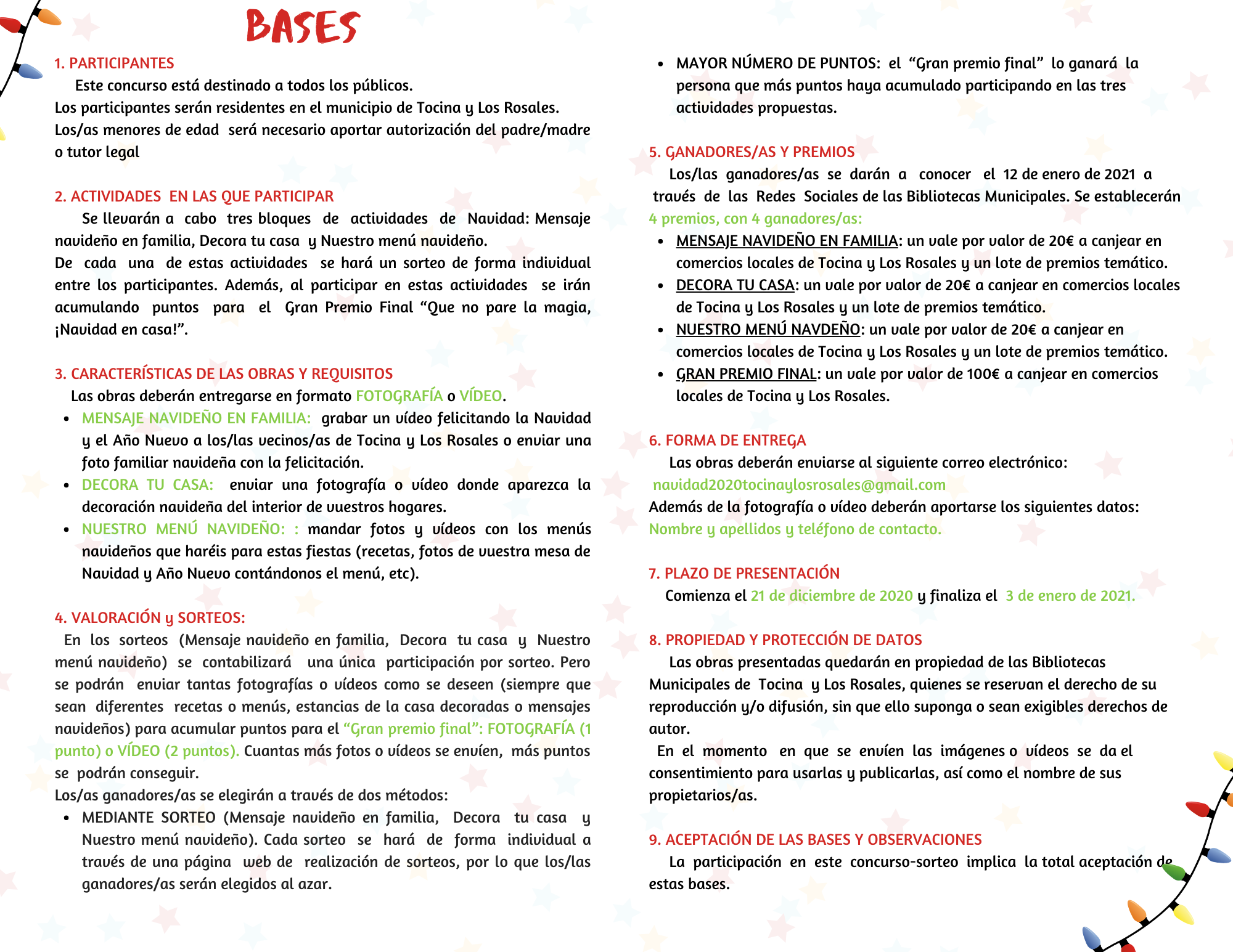 La forma de participar será a través de la creación de fotografías y vídeos de las diferentes temáticas, y deberán enviarse, hasta el 3 de enero, al correo electrónico: navidad2020tocinaylosrosales@gmail.com.