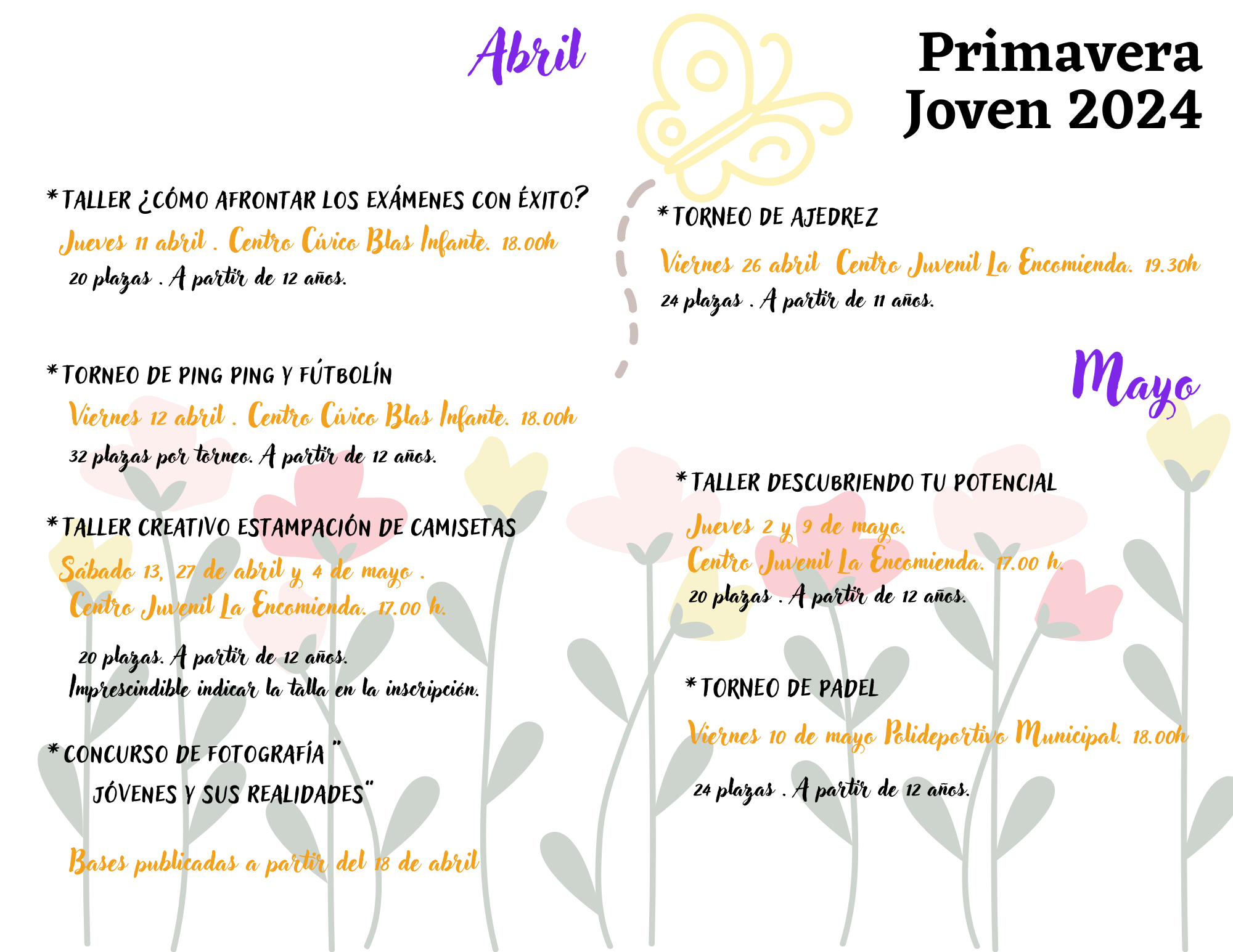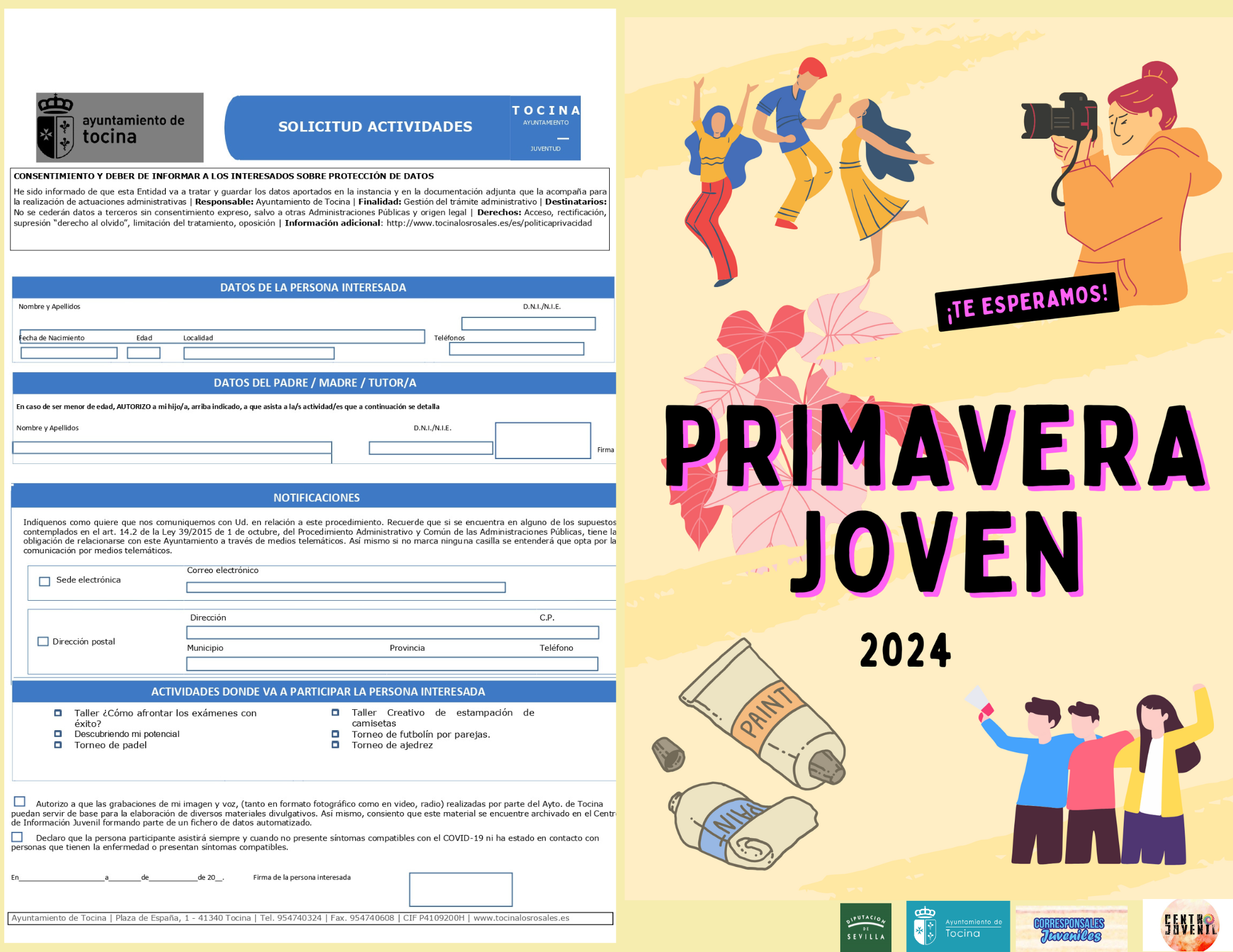 La Delegación de Juventud del Ayuntamiento de Tocina junto al grupo de Corresponsales Juveniles organizan el programa Primavera Joven 2024 para el colectivo juvenil: jóvenes de entre 12 a 30 años de edad, a excepción del torneo de ajedrez que podrán participar también jóvenes de 11 años.Todas las actividades son gratuitas. El plazo para inscribirse comienza el próximo lunes, 8 de abril.