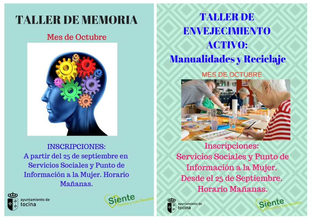 Las inscripciones para estos dos talleres se podrán realizar desde el 25 de octubre hasta completar grupo. Los talleres se desarrollarán simultáneamente en Tocina y Los Rosales. Todas las personas interesadas pueden inscribirse en los Servicios Sociales Comunitarios, de lunes a viernes en horario de 10 a 14 h. y en el Punto de Información a la Mujer, de lunes a viernes en horario de 10 a 14 h. Estas actividades van dirigidas a toda la población interesada en conservar y mejorar su memoria y en especial a personas a partir de 40 años.