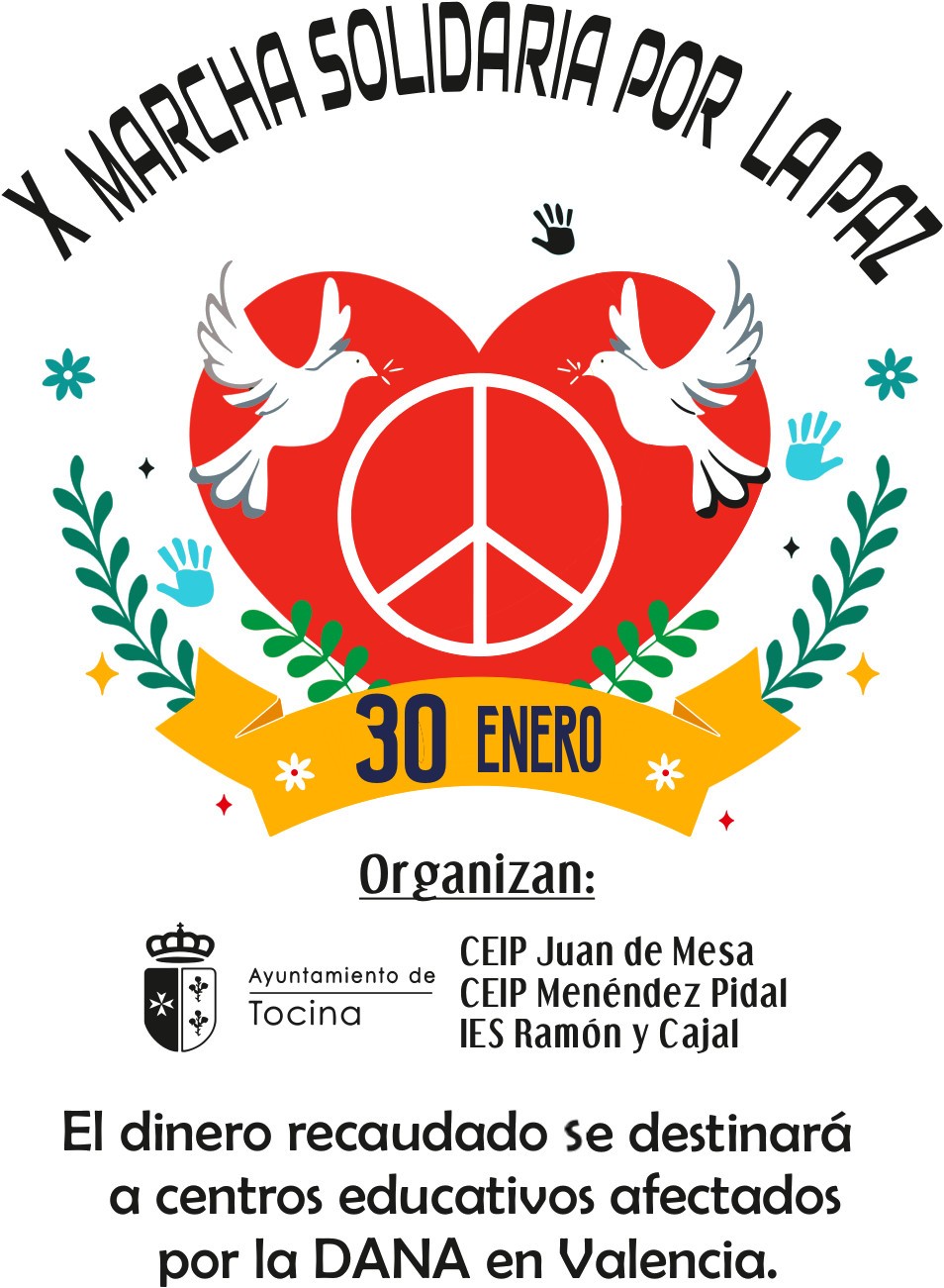 La Delegación de Educación e Infancia del Ayuntamiento de Tocina vuelve a organizar con la colaboración con los centros educativos CEIP Menéndez Pidal, CEIP Juan de Mesa e IES Ramón de Cajal, la marcha solidaria para conmemorar el Día de la Paz, el próximo jueves 30 de enero de 2025.