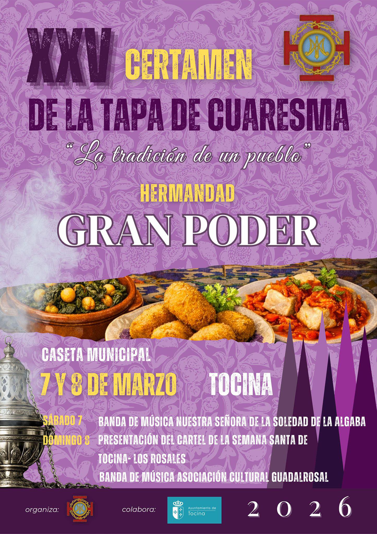 La Hermandad del Gran Poder celebra el XXV Certamen de la Tapa de Cuaresma, una cita plenamente consolidada en el calendario cultural y gastronómico de nuestro municipio. Será los días 7 y 8 de marzo en la Caseta Municipal del recinto ferial de Tocina y Los Rosales.