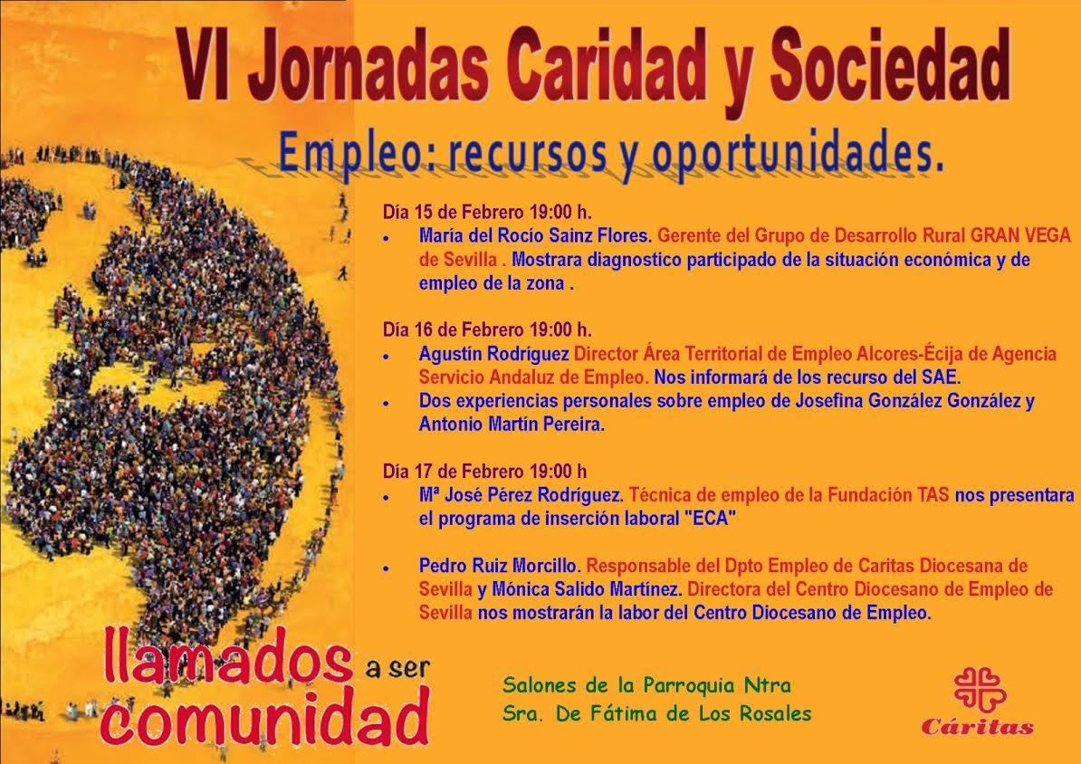 Del 15 al 17 de febrero, en los salones parroquiales Ntra. Sra. de Fátima de Los Rosales tendrán lugar las "VI Jornadas Caridad y Sociedad. Empleo: recursos y oportunidades". Organizadas por Cáritas Diocesana, contará durante los tres días con una interesante selección de ponencias sobre empleo, economía e inserción laboral. Así, el 15 de febrero la gerente del Grupo de Desarrollo Rural Gran Vega de Sevilla, María del Rocío Sainz, hará un diagnóstico de la economía y el empleo de la vega en base a las aportaciones hechas, entre otros, por la ciudadanía que colaboró en mesas de trabajo y encuestas realizadas meses atrás.