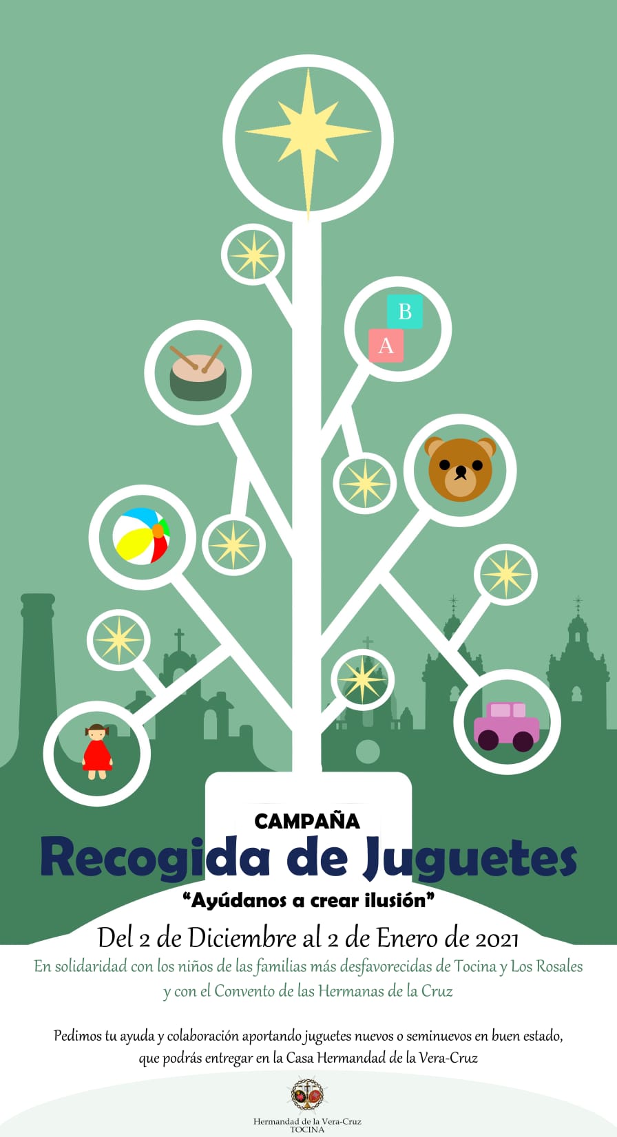 Durante el mes de diciembre y hasta el 2 de enero de 2021, la Hermandad de la Vera-Cruz, desde su Diputación de Caridad, ha organizado una campaña de recogida de juguetes bajo el título “AYÚDANOS A CREAR ILUSIÓN”, destinada a niños/as con necesidad de Tocina y Los Rosales y del Convento de las Hermanas de la Cruz.