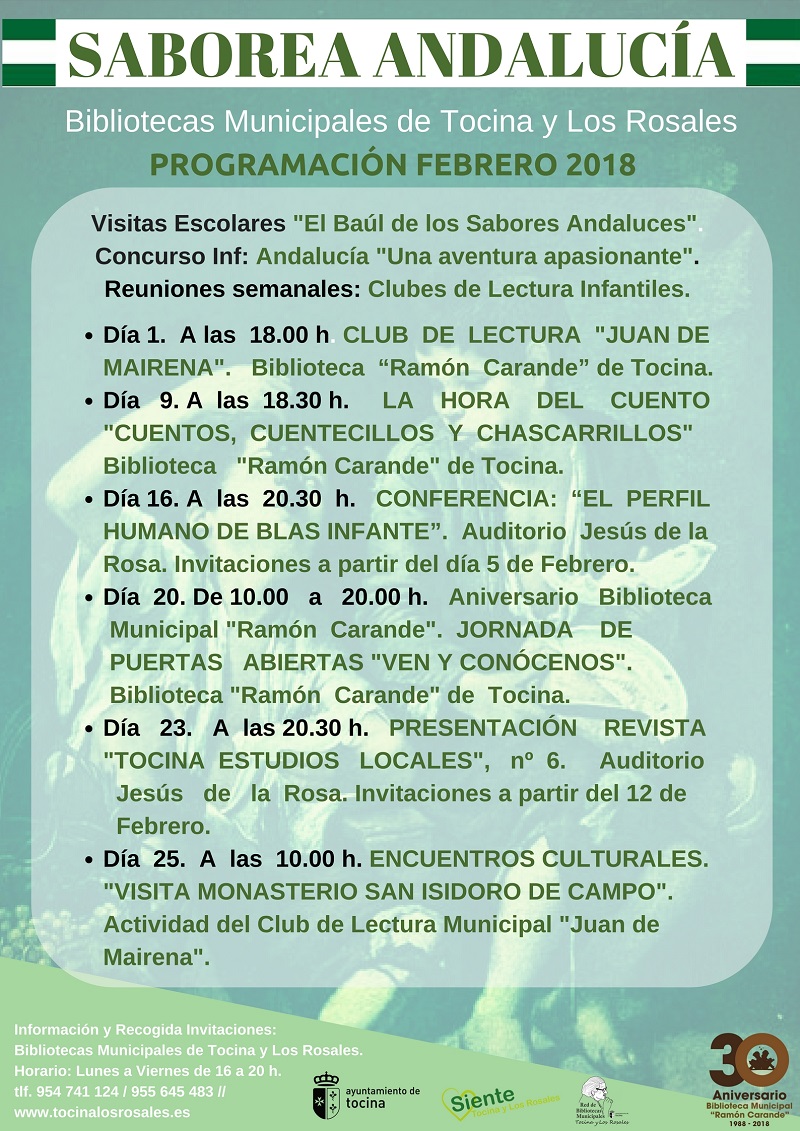 Durante este mes de febrero, se realizarán numerosas actividades para conmemorar el Día de Andalucía y celebrar el treinta aniversario de la Biblioteca Municipal Ramón Carande de Tocina, bajo el título de “Saborea Andalucía”.