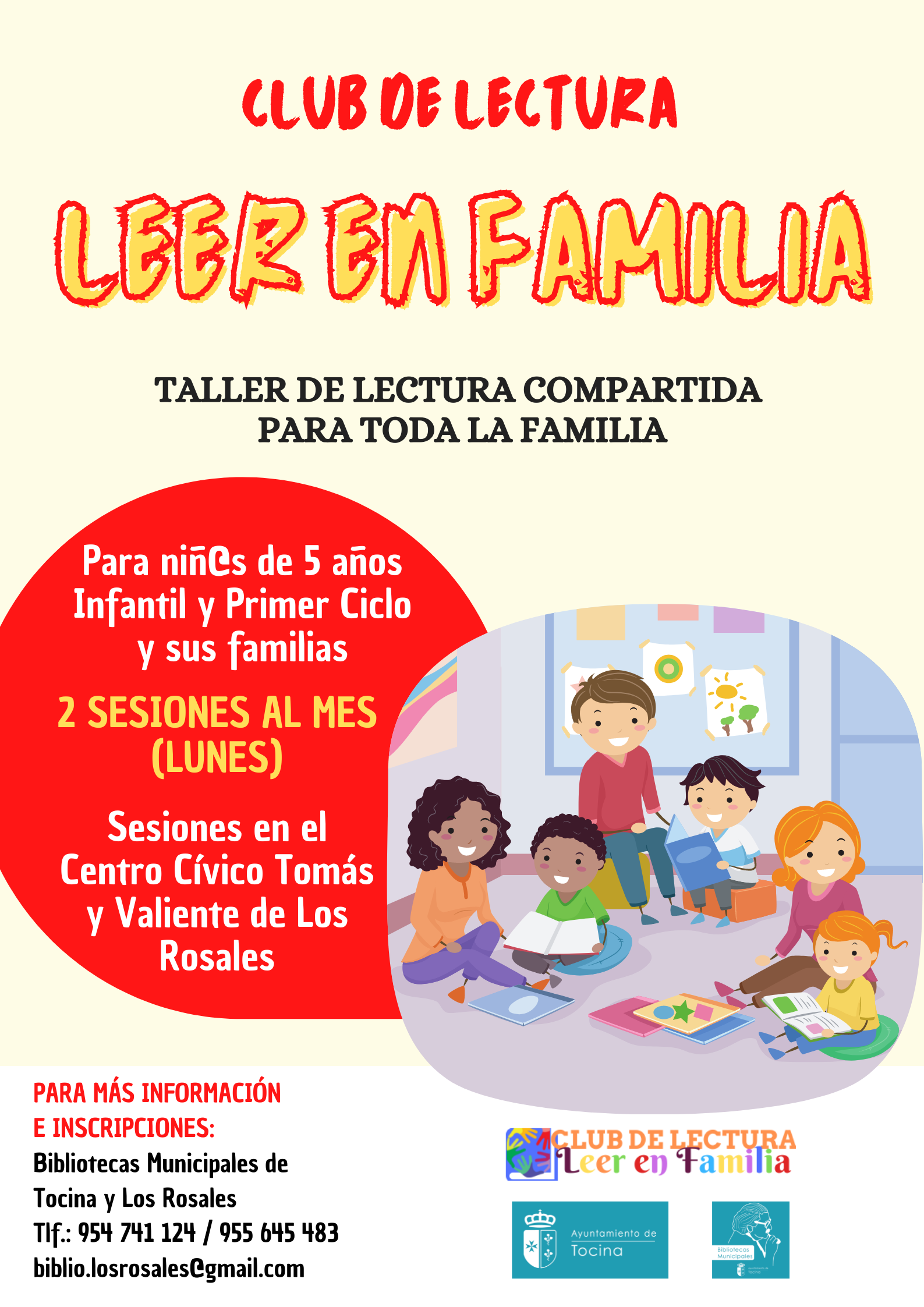 - CLUB DE LECTURA “LEER EN FAMILIA”. Destinado al alumnado de Infantil de 5 años y Primer Ciclo de Primaria y a sus familias. Las reuniones tendrán lugar dos lunes al mes, en el Salón de Actos del Centro Cívico “Tomás y Valiente” de Los Rosales. Las lecturas serán ágiles, dinámicas y que conecten con los gustos y preferencias de los niños de estas edades. Serán historias sobre mundos imaginarios, aventura, amistad, miedo, humor, entornos naturales, etc. La dinámica se llevará a cabo a través del juego, creando un clima cálido, acogedor y participativo, con el objetivo de acercarlos a la lectura y disfrutar con ella. Este club de lectura es impartido por el Narrador Oral Jhon Ardila Cuentacuentos.