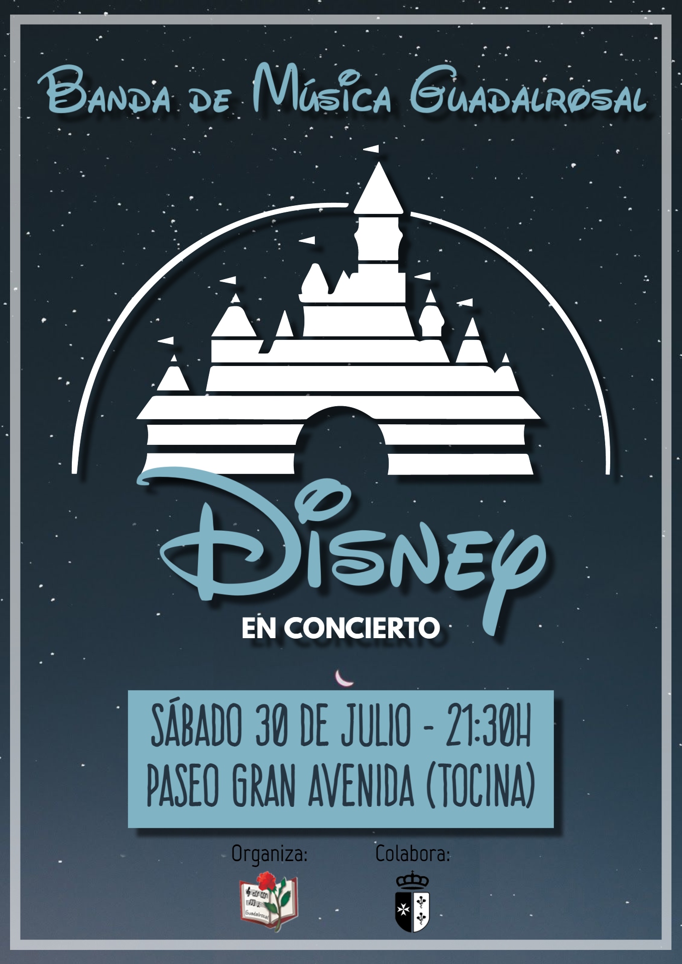 La Banda de Música de la Asociación Guadalrosal en colaboración con el Ayuntamiento, organiza para el 30 de julio un concierto especial, con interpretaciones de temas de las bandas sonoras de las películas Disney. Será a partir de las 21:30 h. en el paseo de Gran Avenida. No faltarán obras como El Rey León, Frozen, Aladín, La Bella y la Bestia, etc.