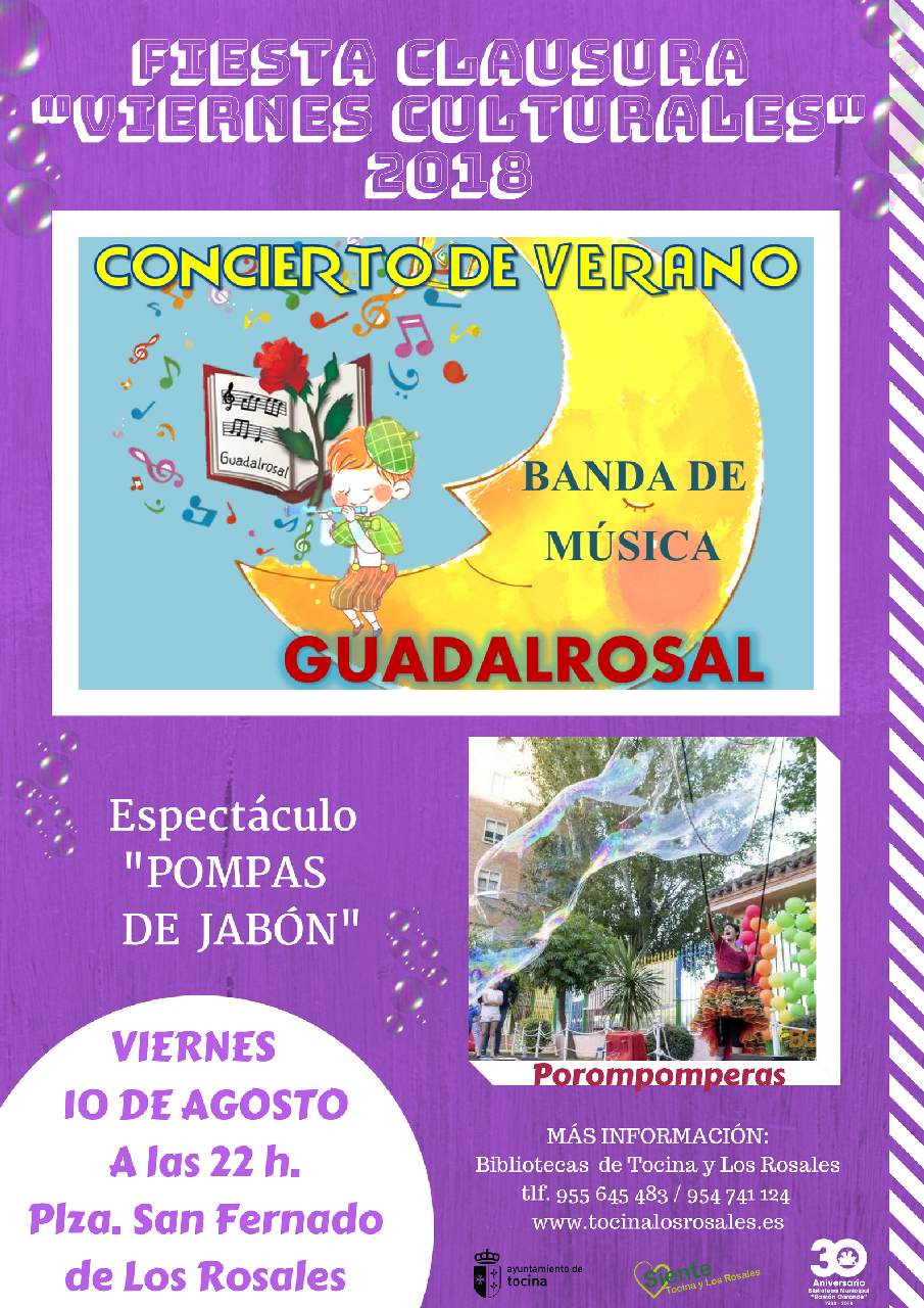 El viernes, 10 de agosto, a las 22 h. en la Plaza San Fernando de Los Rosales, tendrá lugar la clausura de las actividades de verano dirigidas a todas las edades “Viernes Culturales”. Esta última velada incluye un gran concierto de música de la Banda Juvenil Guadalrosal y un espectáculo de pompas de jabón a cargo del grupo Porompomperas.