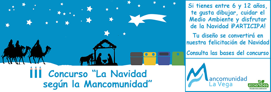 Un año más, la Mancomunidad de La Vega ha puesto en marcha el concurso 'La Navidad según la Mancomunidad', una iniciativa en la cual pueden participar niños y niñas de entre 6 y 12 años del municipio, a través del diseño de una tarjeta de felicitación de Navidad muy especial, que debe conjugar conceptos y motivos navideños (adornos, figuras representativas…), con una frase conmemorativa y referencias, tanto en el diseño como en el contenido, a conceptos relacionados con la separación de residuos, el reciclaje y su impacto en el medio ambiente.