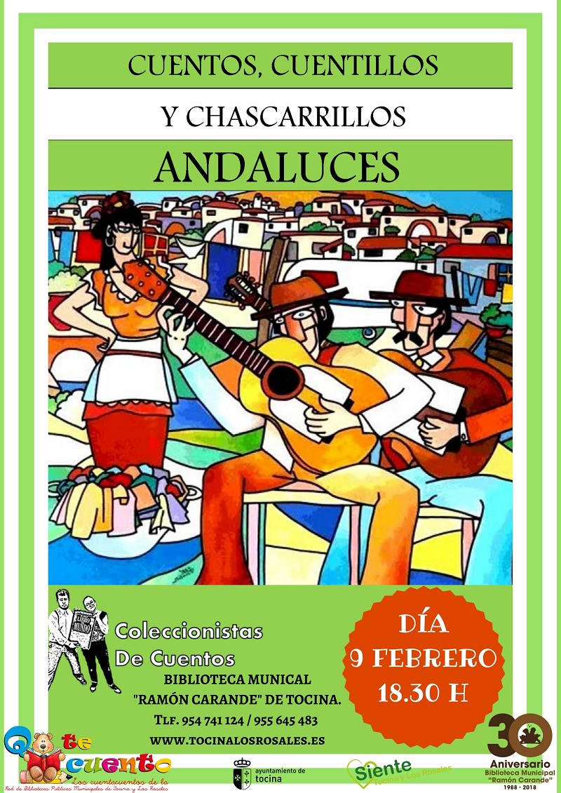 Las Bibliotecas Públicas Municipales de Tocina y Los Rosales comienzan la programación dedicada a Andalucía con una sesión de cuenta-cuentos muy especial, que se titula “Cuentos, cuentecillos y chascarrillos” con Coleccionistas de Cuentos. La sesión tendrá lugar el próximo viernes 9 de febrero, a las 18:30 h. en la Biblioteca Pública Municipal Ramón Carande de Tocina.