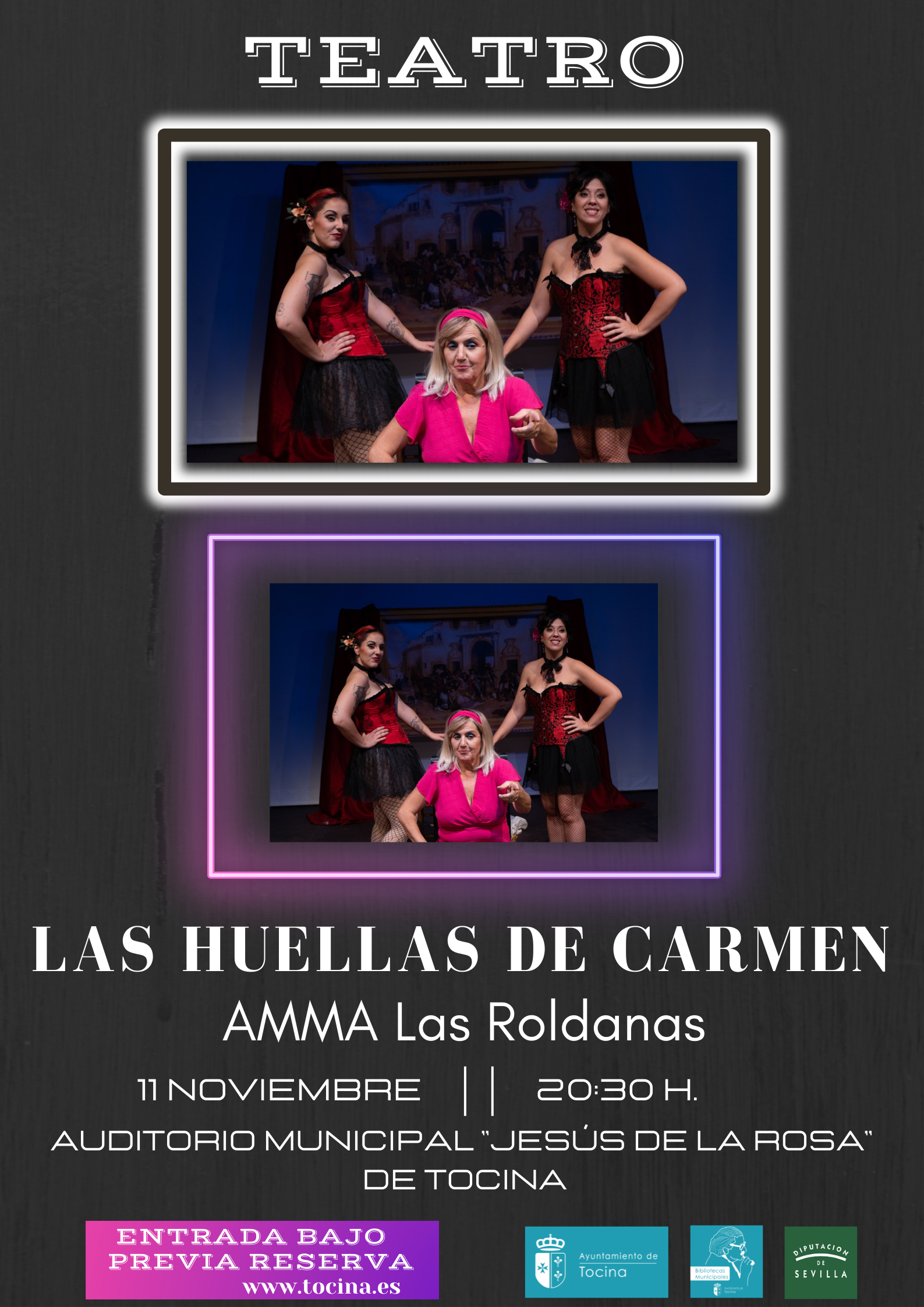 La Delegación de Cultura del Ayuntamiento de Tocina a través de las Bibliotecas Municipales de Tocina y Los Rosales ofrece al municipio la representación teatral “Las huellas de Carmen” el próximo 11 de noviembre en el Auditorio Municipal “Jesús de la Rosa Luque” de Tocina a las 20:30 h. Será interpretado por AMMA Las Roldanas.