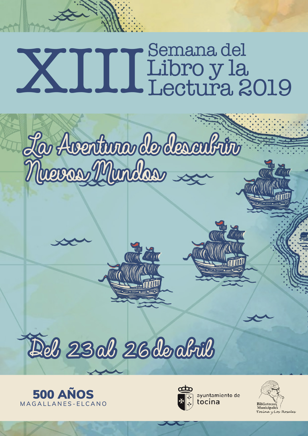 La Concejalía de Cultura del Ayuntamiento de Tocina organiza la XIII Edición de la Semana del Libro y la Lectura en Tocina y Los Rosales, coincidiendo un año más con la celebración del Día del Libro, el 23 de abril. Se rinde así homenaje al libro y la lectura en el municipio. Este año estará dedicado al V Centenario de la Primera Vuelta al Mundo.