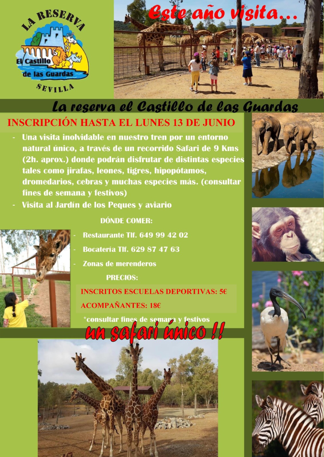 Desde el 1 de junio está abierta la inscripción (hasta el lunes 13 de junio) para niños de escuelas deportivas y familiares. El viaje se realizará en autobús hasta la Reserva, y en ella se hará un safari: trayecto en tren de 9 kms. (2 horas aproximadamente) en el que se podrá disfrutar de todas las especies que habitan en el entorno (jirafas, hipopótamos, cebras, leones, tigres, etc.).