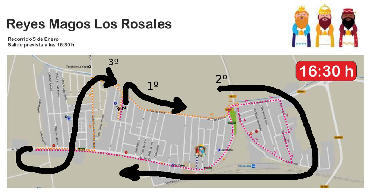 Por su parte la Asociación de Reyes Magos de Los Rosales anuncia que el día 5 de enero a las 16:15 h. los Reyes comenzarán su itinerario andando desde la Plaza San Fernando hasta llegar al Paseo de los Descubridores, tal y como realizaron el pasado año. Una vez suban allí a sus carrozas comenzará el recorrido por las calles rosaleñas. Tras anunciar que se encaminarían en un primer momento hacia el barrio de Las Arenas, para una mejor visibilidad y seguridad en las calles menos iluminadas del recorrido, la Asociación ha modificado su itinerario inicial. Así, primero acudirán por Avda. Carlos Cano al barrio de La Estación, por la carretera Sevilla-Lora (paso a nivel) llegarán a calle Águila, y por calle Alondra el cortejo llegará hasta Avda. El Rosal. Desde ahí se tomará la Avenida de Sevilla, parando a la altura de la calle Virgen de Fátima para que sus Majestades y su cortejo realicen la adoración al Niño Jesús en la Parroquia de Ntra. Sra. de Fátima. Continuarán tras ello por Avenida de Sevilla hasta el barrio de Las Arenas. A la altura de la fábrica El Gracianito (antigua fábrica El Recreo) darán la vuelta e iniciarán así el regreso: por calle  Francisco de Salinas girarán hacia Avda. Carlos Cano hasta llegar de nuevo al paseo de los Descubridores, donde se pondrá punto y final a la cabalgata 2019.