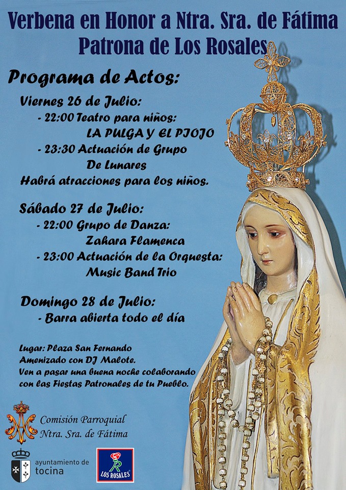La Comisión Parroquial de Ntra. Sra. de Fátima organiza los próximos días 26, 27 y 28 de julio en la Plaza San Fernando la verbena en Honor de Ntra. Sra. de Fátima, que este año ha cambiado sus habituales fechas (semanas previas o posteriores a la festividad de la virgen).