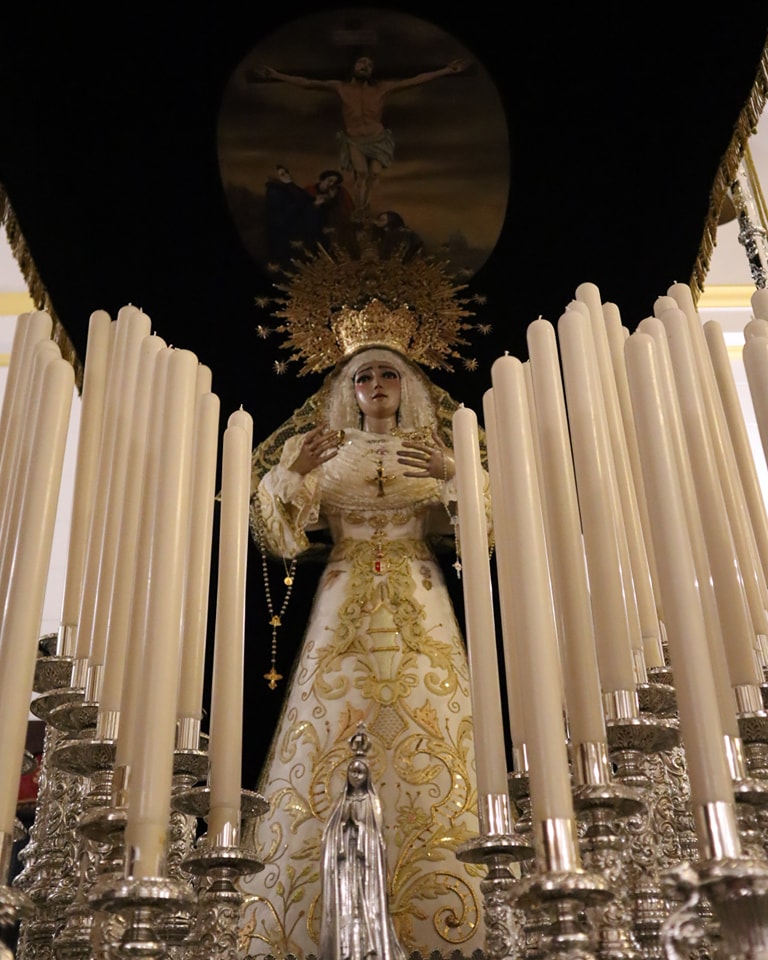 La salida se programa a las 21 h. desde la Iglesia Parroquial Ntra. Sra. de Fátima, con el siguiente itinerario y horas aproximadas: calle San Isidro (21:10), travesía Cristo de la Expiración (21:20), calle Cristo de la Expiración (22:00), Avenida de Sevilla (22:15), calle Virgen de Fátima (22:30), Avd. Carlos Cano (22:45), calle Juan Ramón Jiménez (23:10), calle Luis Cernuda (23:25), calle San José (23:40), calle Doctor Severo Ochoa (00:20), Avd. de Sevilla (00:30), calle San Isidro (00:40), realizando su regreso a la parroquia en torno a la 1 de la madrugada.