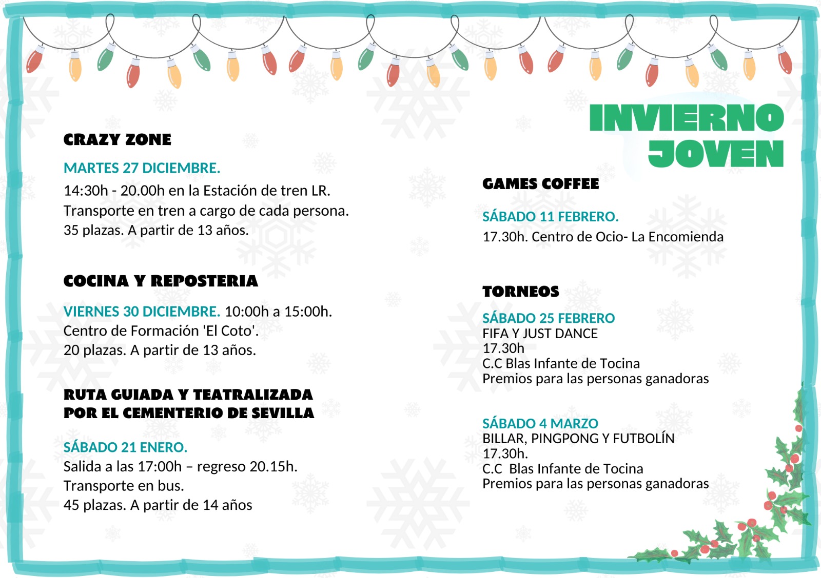La Delegación de Juventud del Ayuntamiento de Tocina junto con el grupo de Corresponsales Juveniles y grupos Que Ideamos, programa Invierno Joven 2022, un conjunto de actividades lúdicas dirigidas al colectivo juvenil que tendrán lugar los próximos meses de diciembre, enero y febrero.
