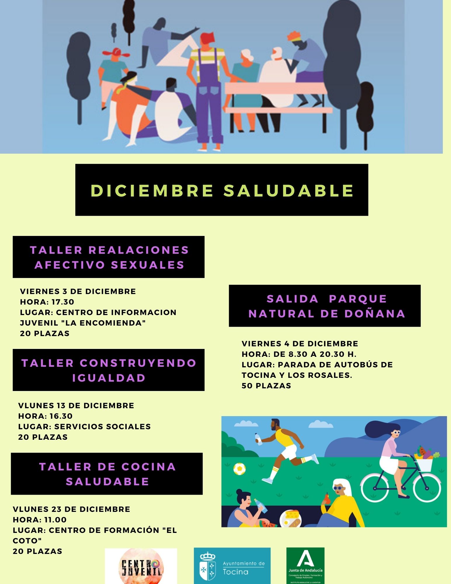 El proyecto “Promoción de la salud en el colectivo juvenil a través de actividades lúdicas y formativas 2021" es una iniciativa de las Delegación de Juventud del Ayuntamiento de Tocina financiado por el Instituto Andaluz de la Juventud dependiente de la Consejería Empleo, Formación y Trabajo Autónomo de la Junta de Andalucía.