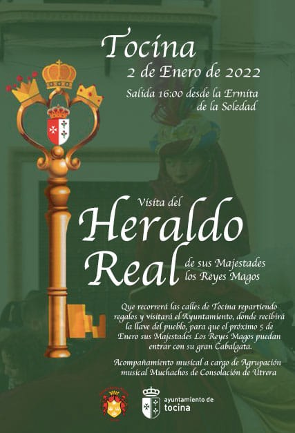 Tras la suspensión, debido a las persistentes lluvias del pasado fin de semana, de la chocolatada prevista para el día 26, el Ateneo de Tocina organiza para el día 2 de enero la visita del Heraldo Real. Con el acompañamiento musical de la Agrupación Musical Muchachos de Consolación de Utrera, el cortejo recorrerá las calles del núcleo de Tocina, recibiendo de manos del primer edil municipal las llaves del pueblo para la más que probable visita de Sus Majestades de Oriente el próximo día 5 de enero.