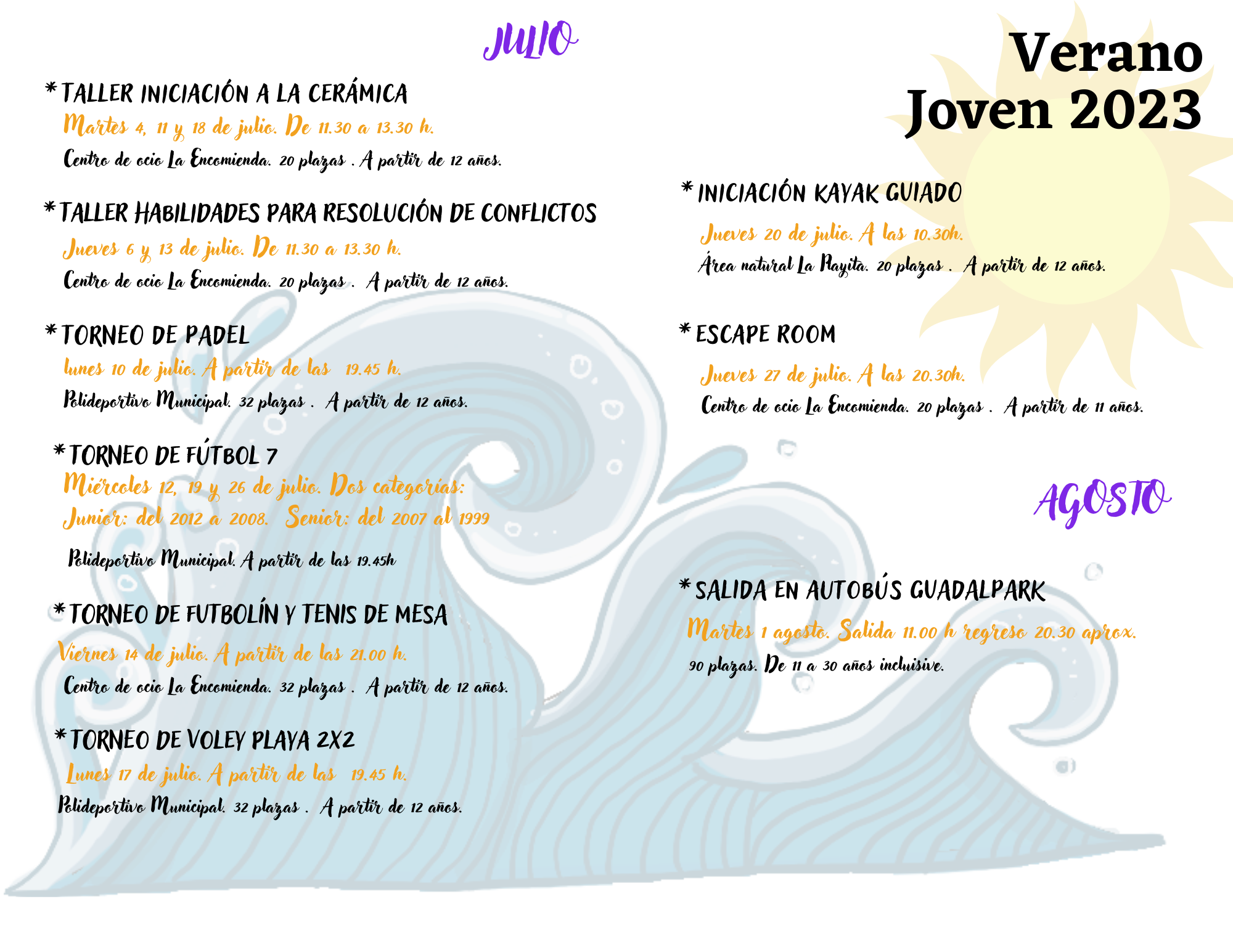 • Torneo de Fútbol 7. Miércoles 12, 19 y 26 de julio. A las 19.45h . Polideportivo. Categoría Junior: personas nacidas del 2012 al 2008 inclusive. Senior: personas nacidas desde el 2007 al 1999. Los equipos pueden ser de 9 personas máximo. Premio para los equipos ganadores. Vale de 120 euros por equipo.