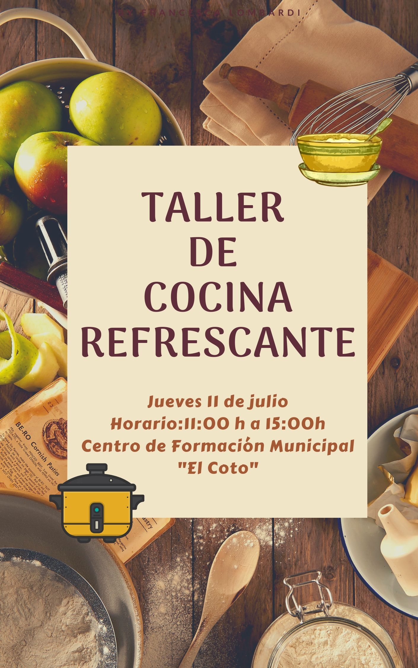 El próximo jueves 11 de julio en horario de 11 a 15 h. tendrá lugar en el Centro de Formación Municipal “El Coto”, el Taller de Cocina Refrescante. En éste pueden participar jóvenes de Tocina y Los Rosales con edades comprendidas entre los 12 y los 30 años; siendo 20 el número de plazas disponibles.