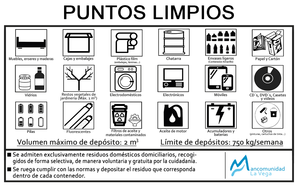 Animamos a todos los vecinos a utilizar de forma correcta los Puntos Limpios. Para ello se debe realizar una selección previa de los residuos para, posteriormente, depositarlos en el contenedor/cuba adecuado. Así, no solo nos permite ofrecer un mejor servicio a la hora de la recogida y tratamiento de basura, sino también favorece la limpieza de nuestros pueblos y ayuda a adquirir buenos hábitos de reciclaje.