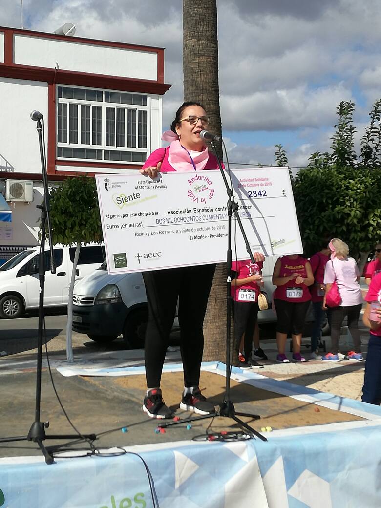 Realizada la marcha “Andarina por la vida” ayer domingo 20 de octubre, se puede afirmar que por sexto año consecutivo la población de Tocina y Los Rosales ha contribuido a la lucha contra el cáncer a través de su participación en esta marcha solidaria. La cuantía de donativos, que van destinados a la Asociación Española Contra el Cáncer (AECC), ha llegado este año a la cantidad de 3.056 Euros. Además de esta cantidad, que se recogió a través de las inscripciones para la marcha, también se donó a AECC la cantidad recaudada a través de los monederos y pulseras rosas cedidos por AMPA La Vega (Asociación de Madres y Padres del IES Ramón y Cajal), que sumaron un total de 151,87 euros.