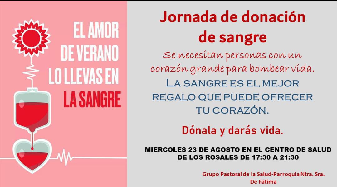 Mañana miércoles, 23 de agosto habrá una campaña de donación de sangre en Los Rosales. Será en el el centro de salud, Avenida de Sevilla, 66 en horario de 17:30 a 21:30 h.  Se necesita sangre de todos los grupos.